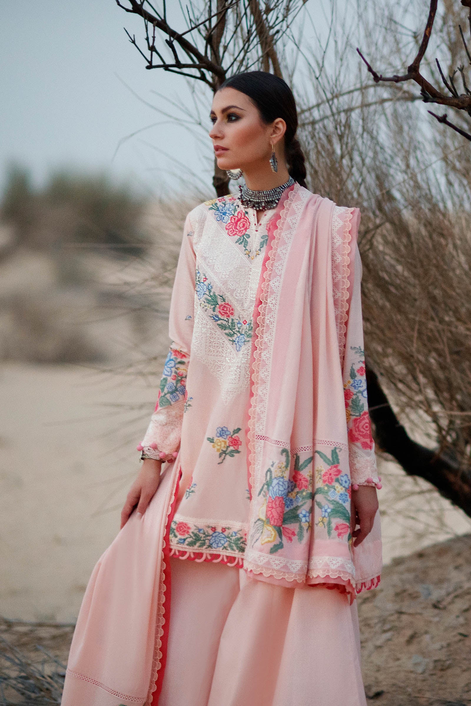 'Allysiah' features an efflorescent amalgamation of delicate pastel pink, deeper rose, azure blue, forest green and zesty lemon that accentuate the perfect sorbet peach lawn canvas. Exquisitely composed in cross stitch and crochet lace stitches, the shirt is paired with a vividly adorned dupatta boasting bold floral motifs on the pallus and intricate crochet borders on all four sides. This playful feminine design perfectly encapsulates the spirit of spring and is one of our favourites for the upcoming Eid.