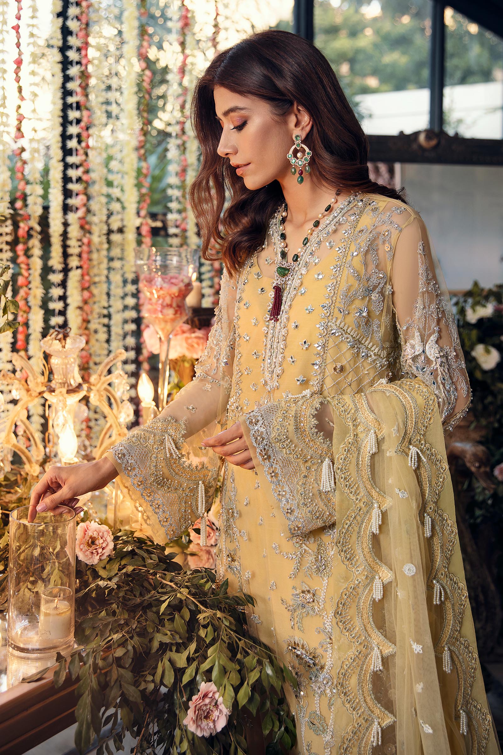 A soft aurelion yellow is adorned with intricate threadwork that scintilates with delicate seed pearls and glistening gota in ‘Astrella’. An elegant elongated shirt is crafted from ethereal tulle that beautifully details delicate florals and vines with dainty pearls smattered across the canvas to create a provocatively captivating design. The shirt comes paired with a tonal trouser and a sumptuously embroidered dupatta enhanced with a gilded scolloped border.