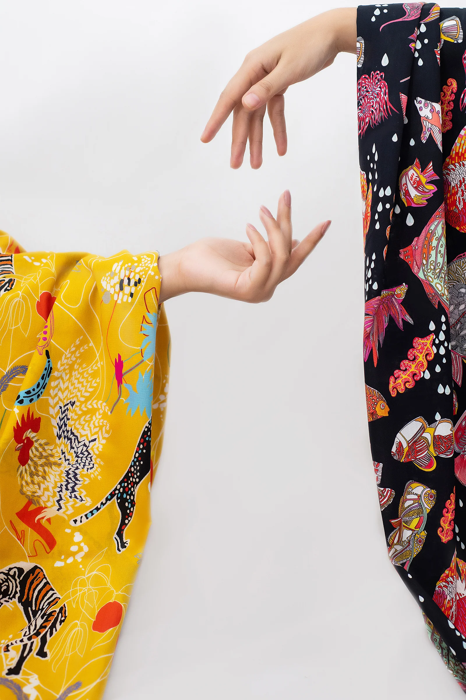 A cheery Tuscan yellow canvas; Aylin' is adorned with a fusion of abstract line illustrations, quirky jaguars and retro geometric doodles in contrasting shades of scarlet, tangerine, turquoise and black. This one of a kind statement print is vibrantly chic and sure to brighten your days!