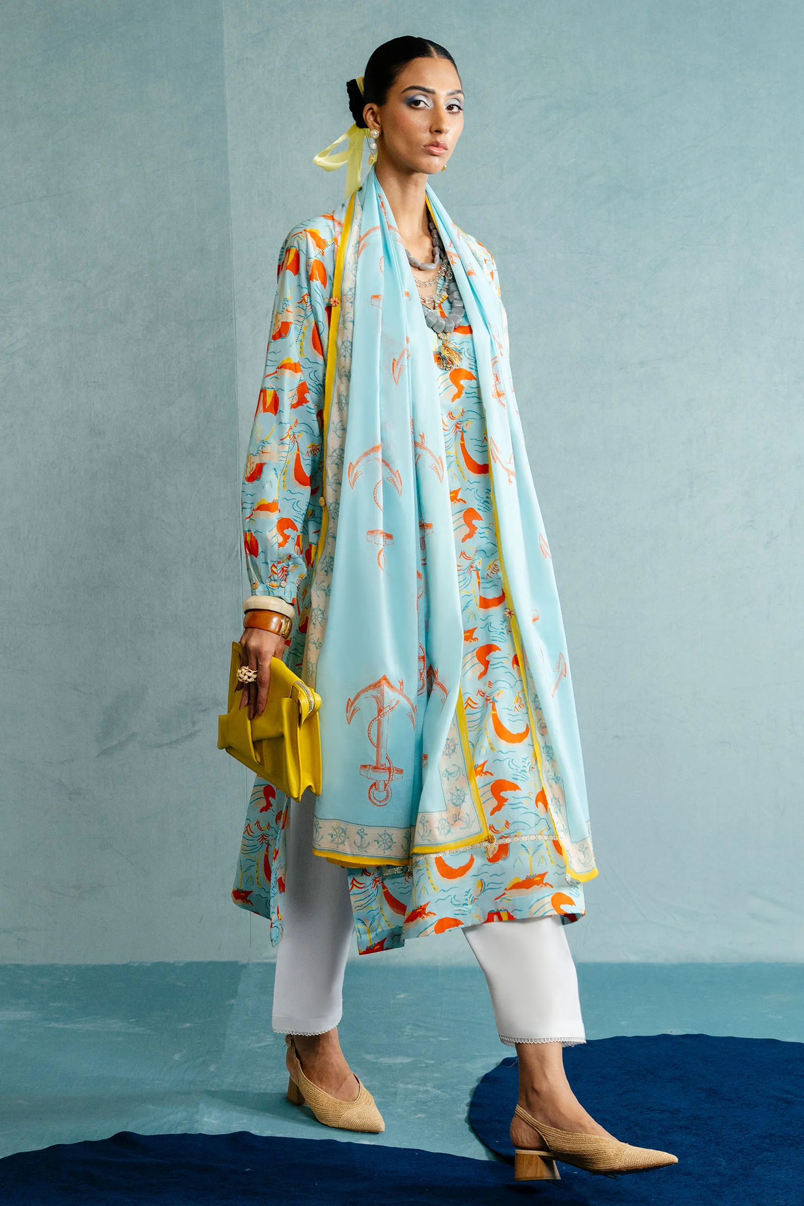 Ivory lace gently outlines the hem, adding a touch of polish to its relaxed flow. Paired with pearl-white tapered shalwar, the look feels crisp, fresh, and full of breath. The voile dupatta? A bold contrast in orange, anchored by water motifs and kissed with a citrus yellow border — like a summer breeze caught mid-movement.