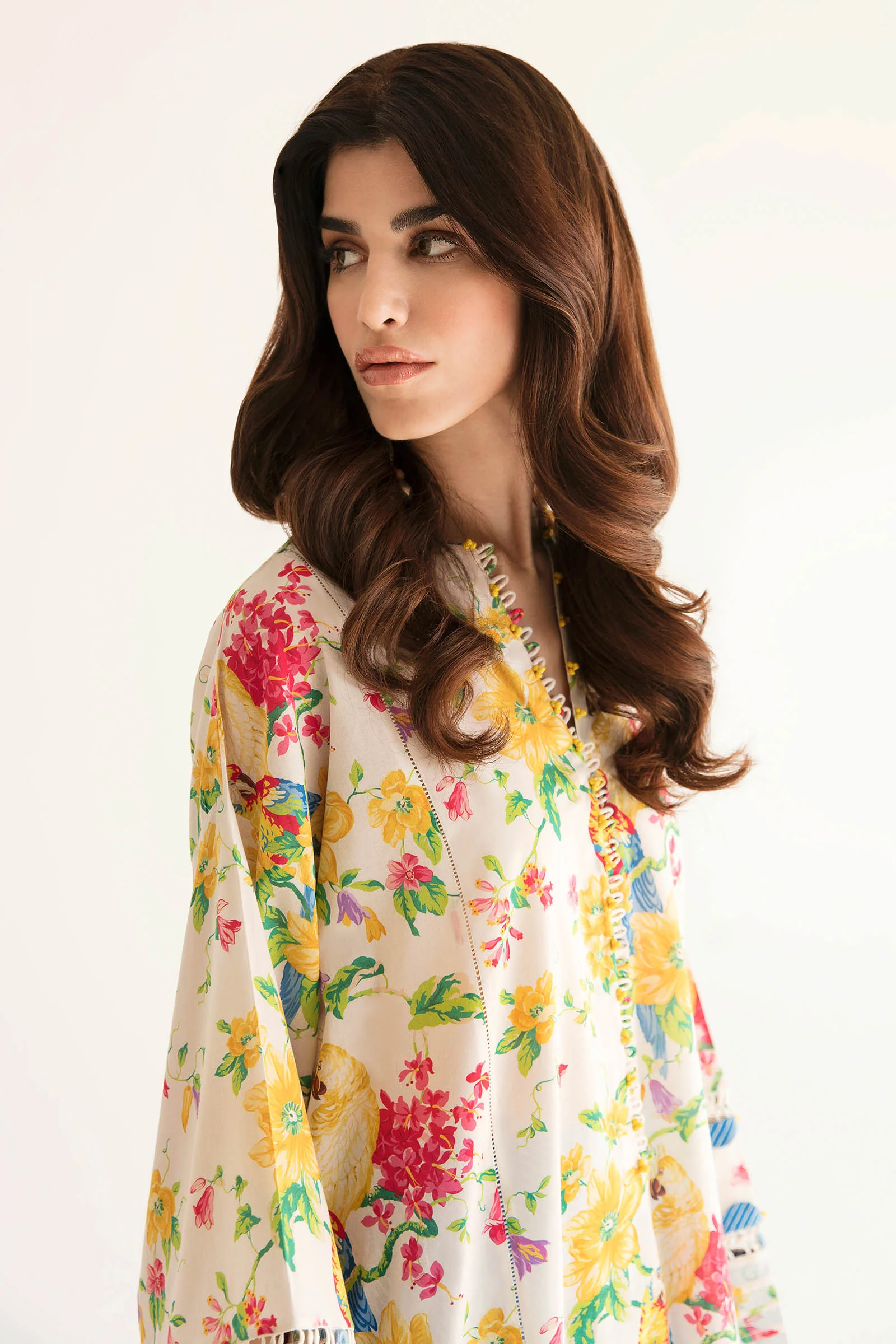 Meet 'Emre,' a ready-to-wear masterpiece blending celestial allure and vibrant aesthetics. The ivory shirt features vivid flora in shades of yellow, berry, scarlet, azure, and green. Paired with a bright blue shalwar and intricate ivory scalloping, it offers comfort on hot summer days. 'Emre' leaves a lasting impression wherever you go.