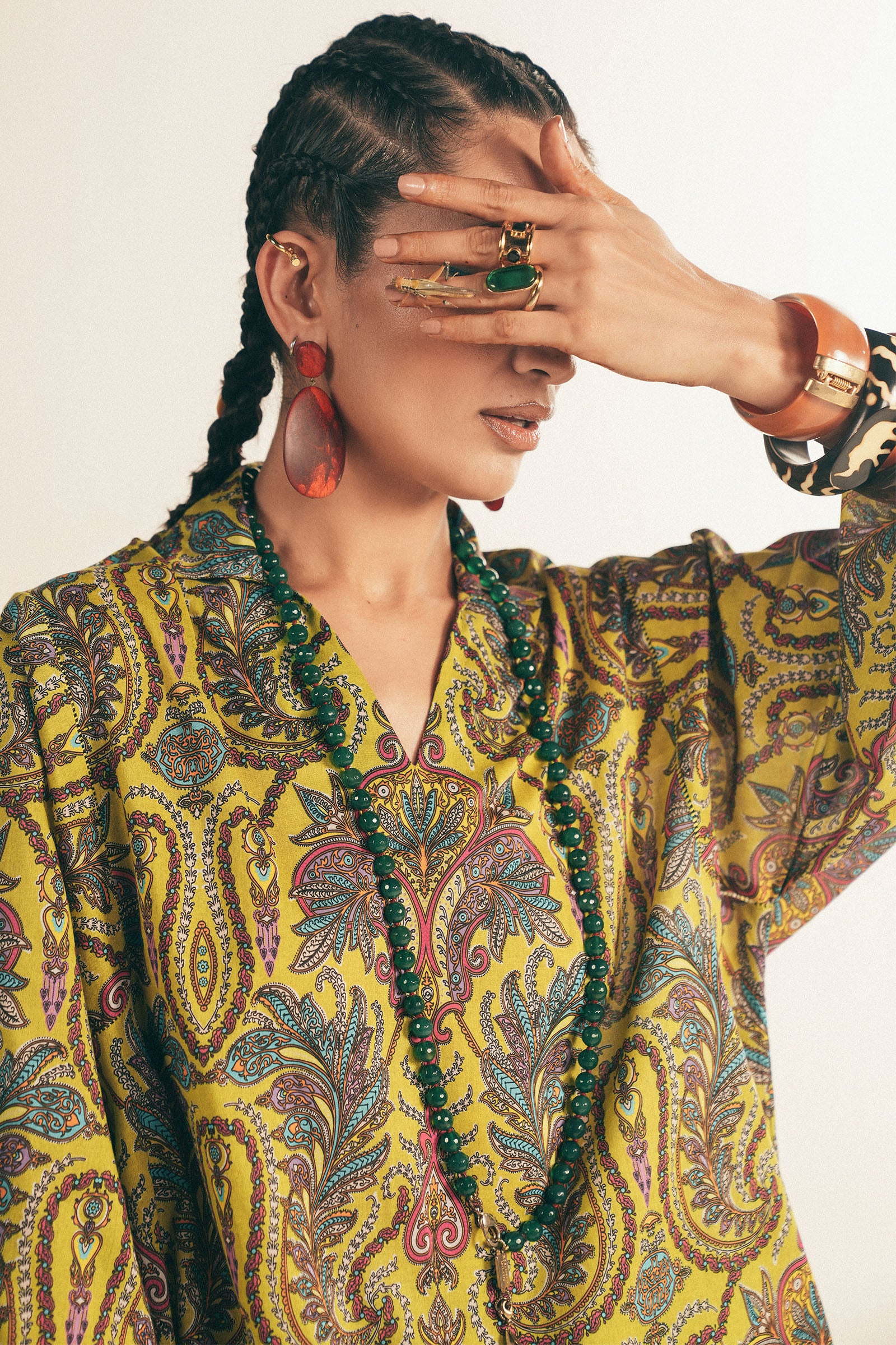 A zesty lime base drenched in jewel-toned paisleys and intricate patterns — like a full-on print party you wear.