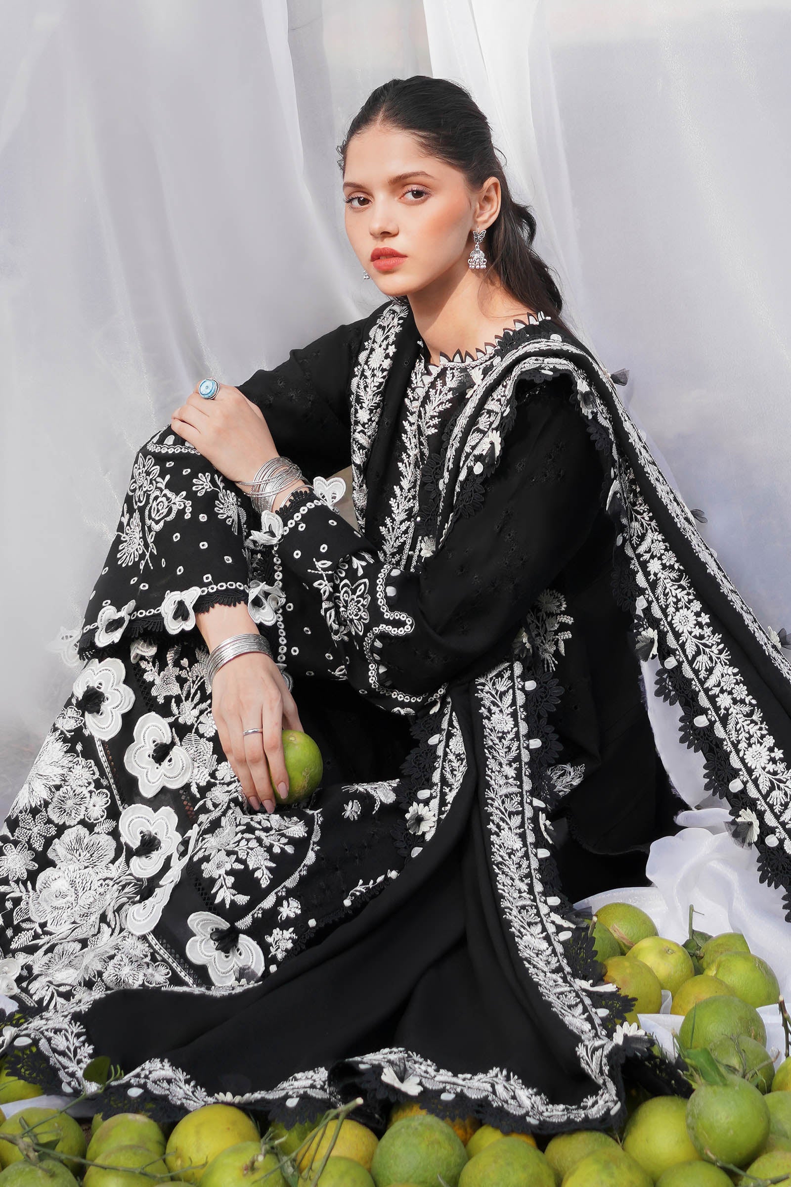 The bewitching tapestry commences on a canvas of midnight ebony, serving as the backdrop for resplendent embroidered florals intricately woven with luminous ivory threads. Accompanying this opulent creation is an embroidered chaddar, casting a spell of enchantment upon any occasion. Whether indulging in an al fresco luncheon or attending an evening soiree, 'Firuzeh' unfolds as an embodiment of refined sophistication, evoking echoes of classical aristocratic style sensibilities.n.