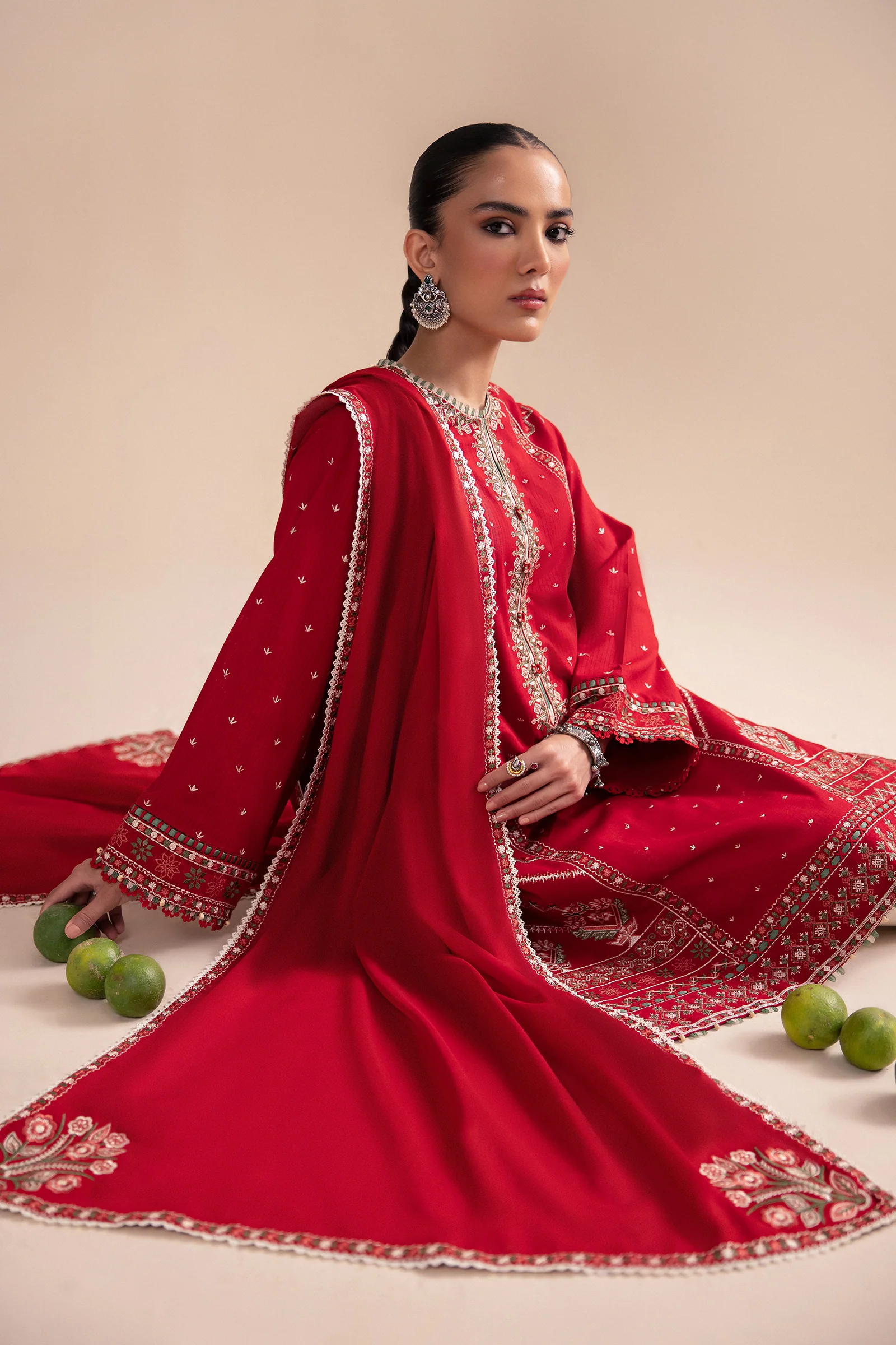 With the arrival of autumn, 'Ghermez' beautifully captures the season’s charm on a striking scarlet canvas, adorned with intricate tribal embroidery in soothing shades of celestial white, sage, and scarlet. The refined detailing along the neckline and borders reflects true craftsmanship, while the dupatta, featuring an etched motif on the pallu, adds a touch of elegance. Each stitch in 'Ghermez' tells the story of autumn’s enchantment—crisp mornings, vibrant leaves, and the fleeting beauty of the season. It’s a perfect fusion of warmth and sophistication, embodying the timeless allure of fall’s transition