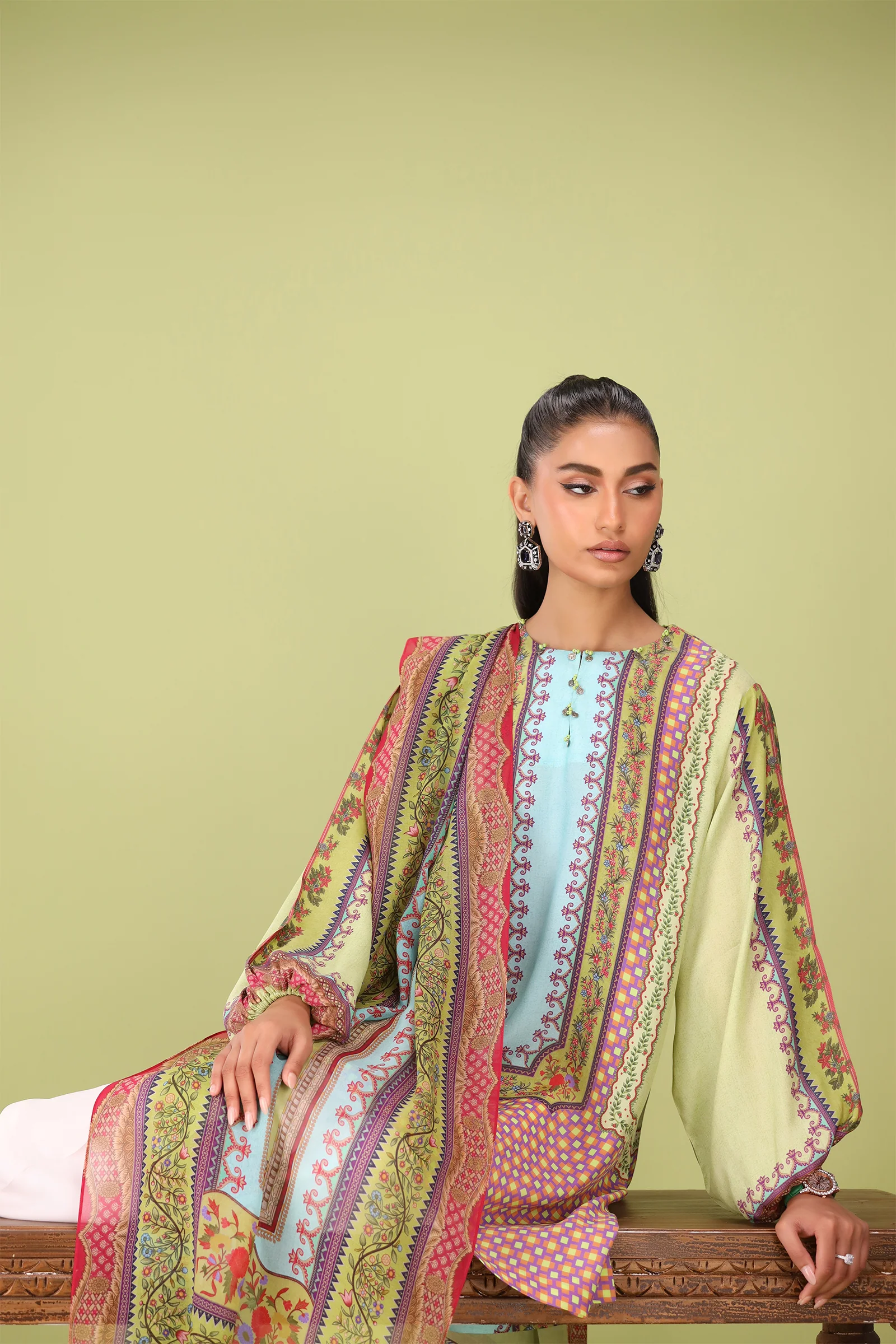 Gracefully designed with billowing sleeves that evoke effortless movement and a beaded neckline that adds a touch of opulence, this silhouette is both bold and ethereal. Paired with an artfully illustrated dupatta, adorned with delicate beaded embellishments, this ensemble exudes luxury and sophistication. A vision of grandeur, it is the perfect choice for the woman who commands attention with undeniable elegance.