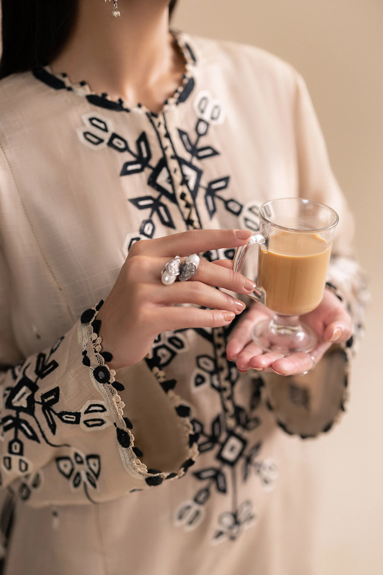 Introducing "Kahii," a masterpiece on a beige canvas, intricately detailed with tribal embroidery that speaks to tradition and artistry. The boxy kurta silhouette, paired with tonal trousers, mirrors the quiet cadence of falling leaves, creating an ensemble that harmonizes with the season. "Kahii" captures autumn’s delicate beauty, fusing elegance with strength in every stitch. Designed for the modern woman, this look embodies timeless sophistication, where the warmth of autumn is reflected in the thoughtful details and refined craftsmanship. In "Kahii," every step becomes a graceful nod to the season’s serene allure.