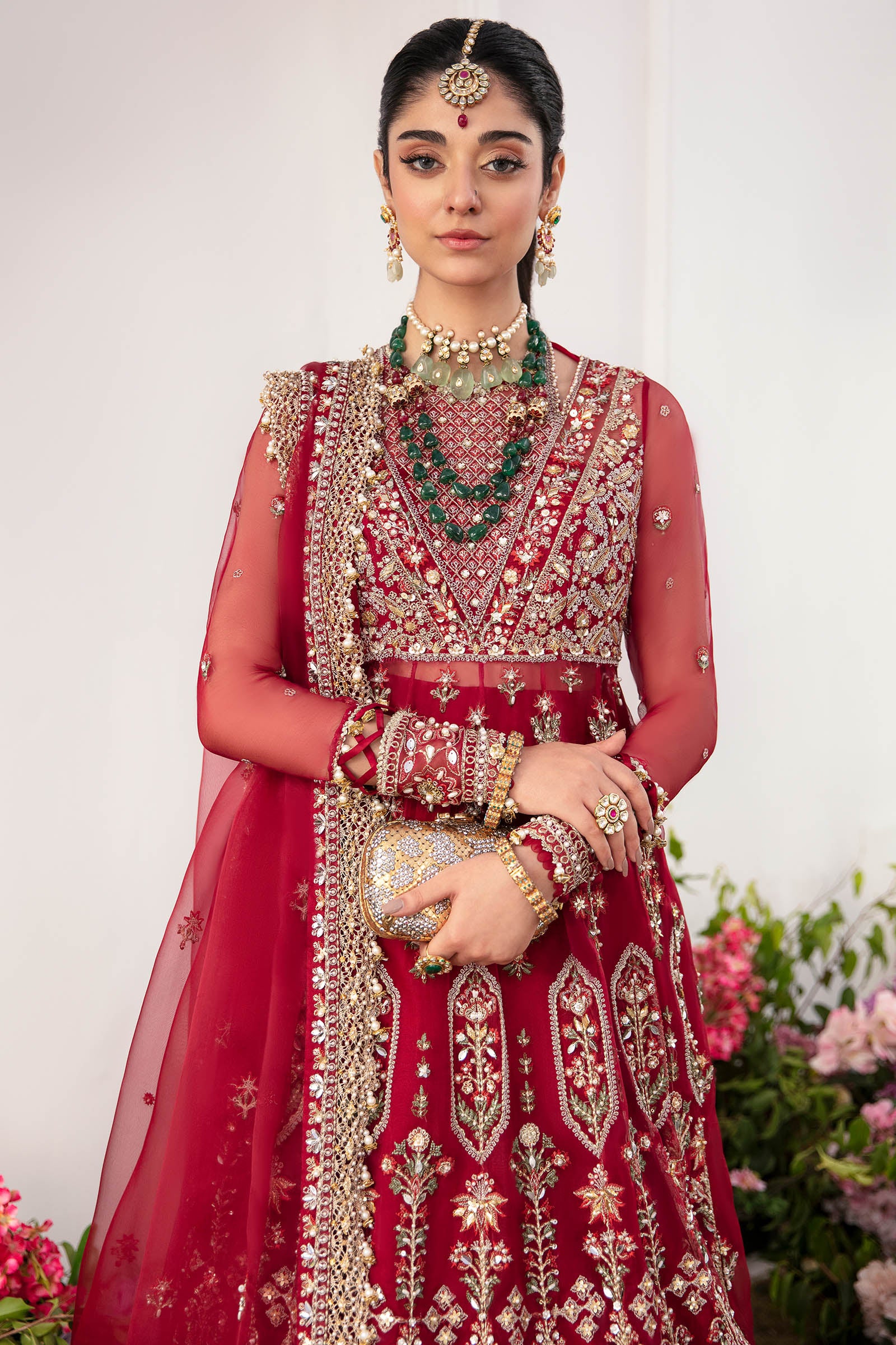Introducing 'Kyra,' a scarlet masterpiece adorned with intricate embroidery in sage, red, and ivory threads that shimmer with tilla accents. This elegant ensemble features a meticulously crafted bodice, a gracefully flowing sheer organza fabric and a cinched belted waist, exuding timeless femininity. Completing the look is a richly embroidered organza dupatta rendered in scaret and a dramatic lehanga for a touch of grandeur. 'Kyra' is an instant classic, a work of art that transcends trends, capturing the essence of enduring beauty and making a lasting impression at all festive occasions.