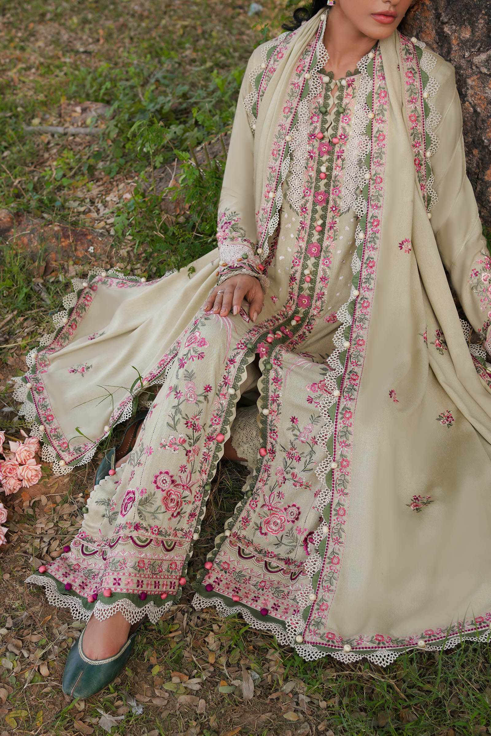 An artfully depicted canvas in a lustrous creamy beige serves as the backdrop for the enchanting narrative of 'Sarv.' Intricate embroidery masterfully captures the blossoming flora, resulting in a mesmerizing composition. Paired harmoniously with a dreamily bordered shawl, this design epitomizes the ideal ensemble for a sartorial garden affair, weaving an allure that transcends the ordinary.