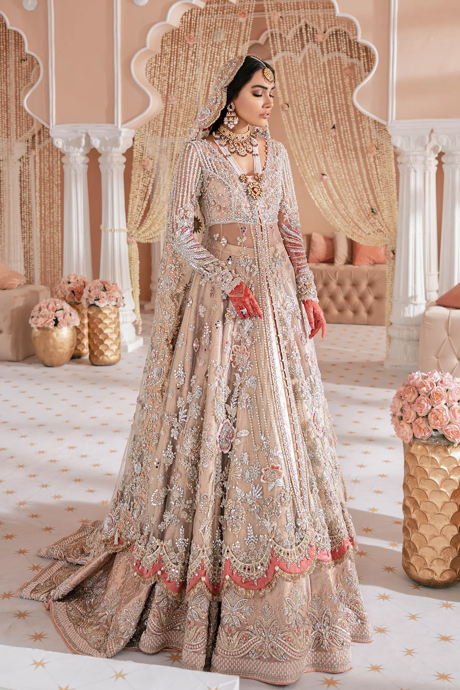 Brimming with old world charm, this classic ensemble features a front open anarkali silhouette in ivory. Crafted from ivory net with silver and gold ganga jamni work with accents of coral and auburn silk thread, it is paired with a brocade lehenga with a handworked border and a fully embellished duppatta with a border and an all over spray.