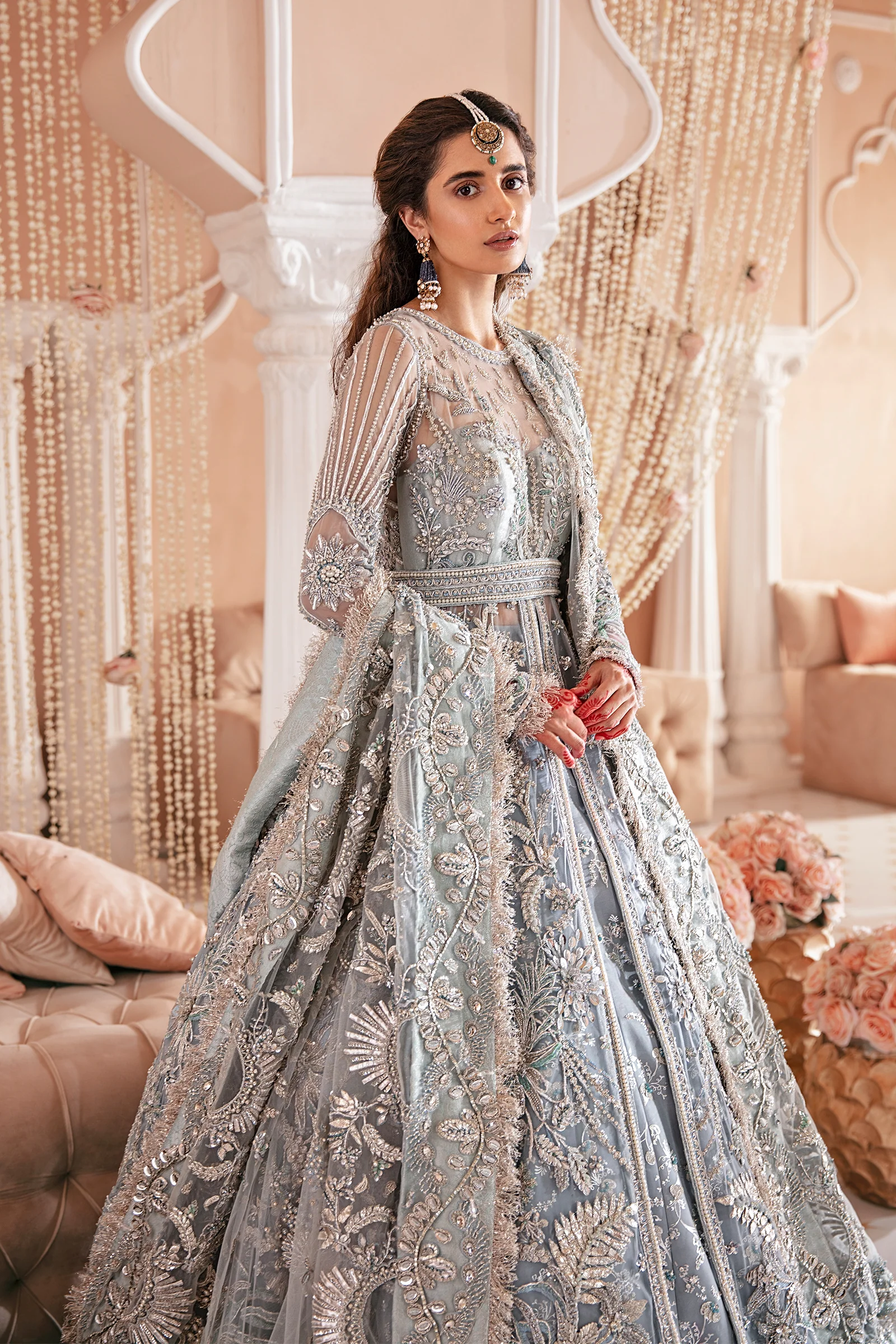Make any event a celestial affair in this utterly gorgeous all silver couture look. The shirt is panelled with silk thread and silver zardozi work with crystals. It is paired with a net dupatta with a heavily worked border and an organza lehenga with a silver screen print and further hand embellishments.